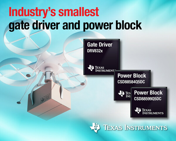 DALLAS, May 23, 2017 /PRNewswire/ -- Texas Instruments (TI) (NASDAQ:TXN) today introduced two new device families that help reduce size and weight in motor drive applications. When used together, DRV832x brushless DC (BLDC) gate drivers and CSD88584/99 NexFET™ Power Blocks require as little as 511 mm2, half the board space of competing solutions.